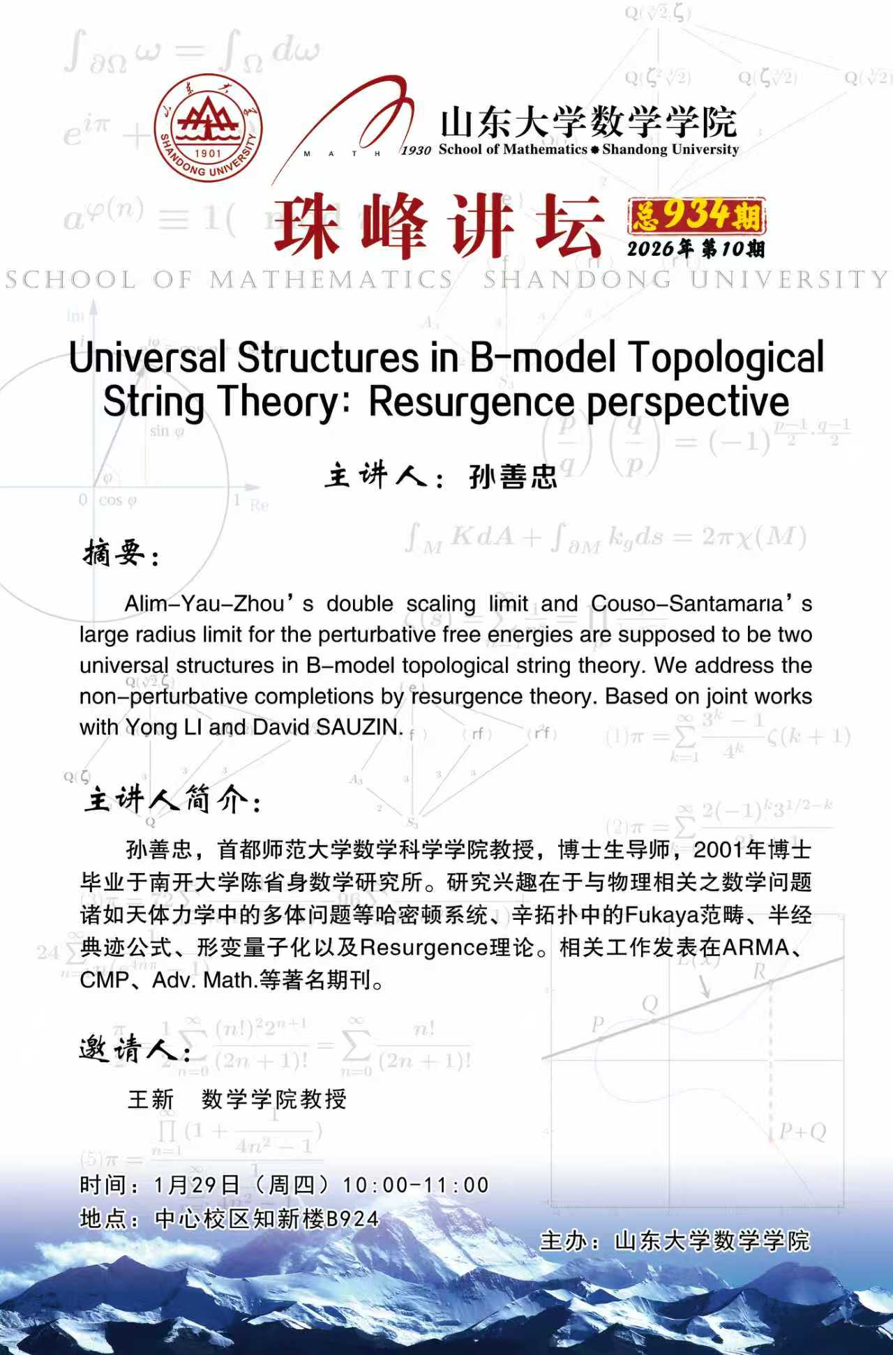 上一条:BB贝博艾弗森官网珠峰讲坛第934期:Universal Structures in B-model Topological String Theory:Resurgence perspective
