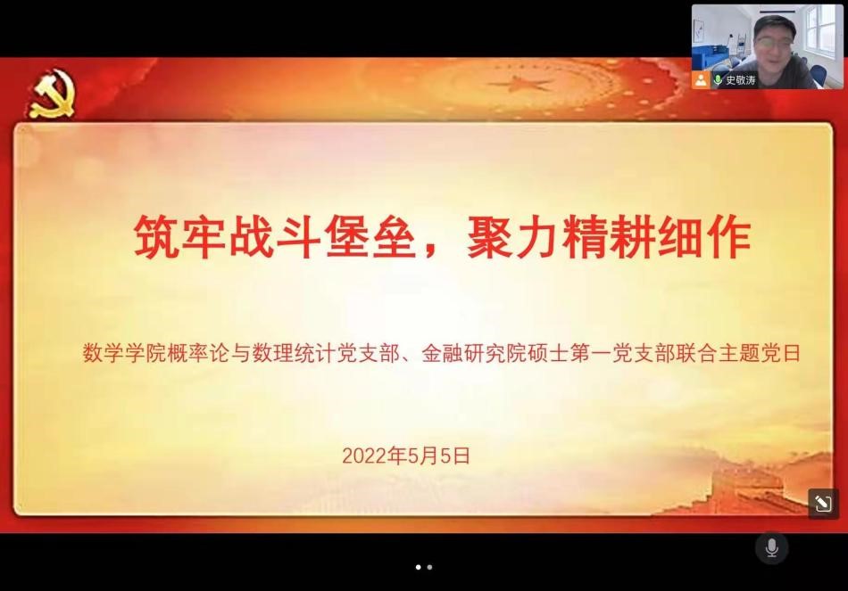 5月5日,BB贝博艾弗森官网概率论与数理统计党支部与金融研究院硕士第一党支部联合开展了主题为“筑牢战斗堡垒,聚力精耕细作”的联合主题党日活动,活动线上进行,共19名师生党员参加了活动。