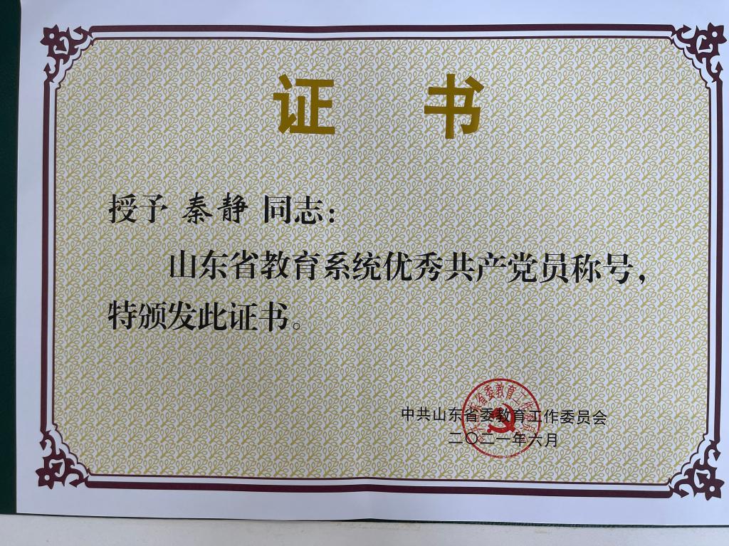 近日,时值伟大的中国共产党诞辰100周年之际,中共山东省委教育工委下发了《中共山东省委教育工委关于表彰山东省教育系统优秀共产党员、优秀教育工作者和先进基层党组织的决定》,我院教师党员秦静获评山东省教育系统优秀共产党员。