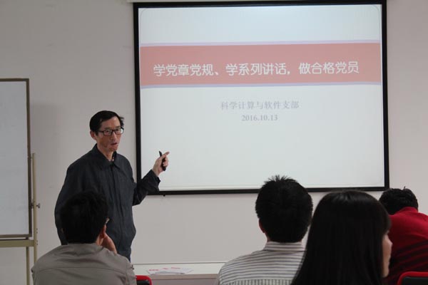 10月13日下午,为更好的推动学院“两学一做”学习教育,BB贝博艾弗森官网各教工党支部分别召开了“两学一做”系列党课,在全院形成了多个党课会场同时学习的热烈场面。行政机关党支部开展的是关于中国共产党在廉洁自律方面的要求,并且集中学习和讨论了《中国共产党纪律处分条例》,结合工作生活中的实例和时事,谈了自己的看法。基础数学党支部结合党章具体要求,讲了一流大学建设过程中,如何做优秀的合格党员。金融研究院党支部进一步深入学习了习近平总书记的讲话,联系工作中的实际,展开了热烈的讨论和交流。运筹党支部、应用数学党支部、计算数学党支部、概率统计党支部、控制党支部书记都分别紧扣“两学一做”中的重要专题,运用身边实例,给支部党员们上了生动的党课。