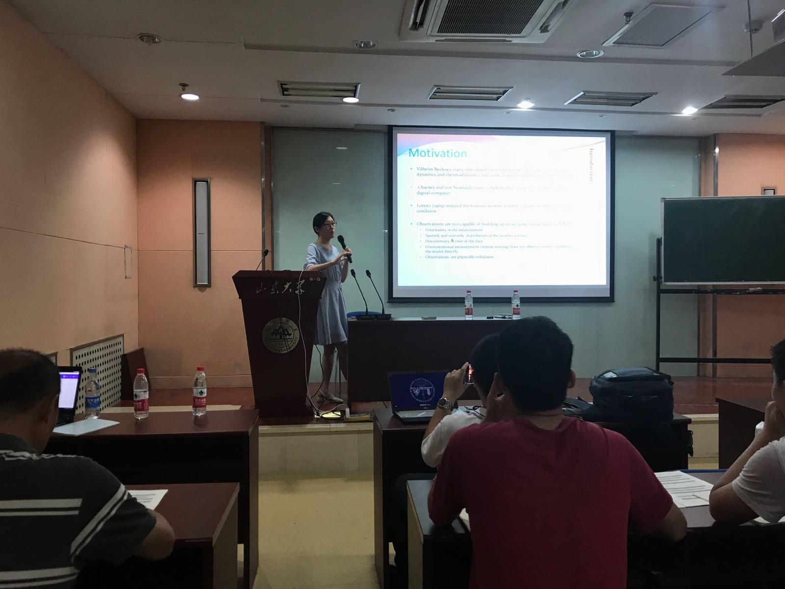 在暑期学校授课期间,16位国内外学者就数据同化的理论与应用、计算方法等问题进行了交流与探讨。其中,代尔夫特理工大学Arnold Heemink教授由浅入深讲解了数据同化的由来,将经典滤波及控制理论延伸到数据同化的诸多应用,从线性问题的处理讲到数据同化处理非线性问题时的难点。国家气象局韩威研究员详细概述了卫星数据同化的发展现状,并结合气象预测中的卫星同化问题向学员讲述了目前的同化具体算法。复旦大学陆帅教授从数学的角度出发讲授了数据同化背后的数学基础理论,就离散数据同化及连续数据同化给出了详细的推导及证明。荷兰应用科学研究院Arjo Segers研究员深入讲解了数据同化在空气质量以及温室气体预测方面的前沿进展,即集合卡曼滤波、三维变分方法在空气质量上的应用,四维变分方法在气候变化上的应用。