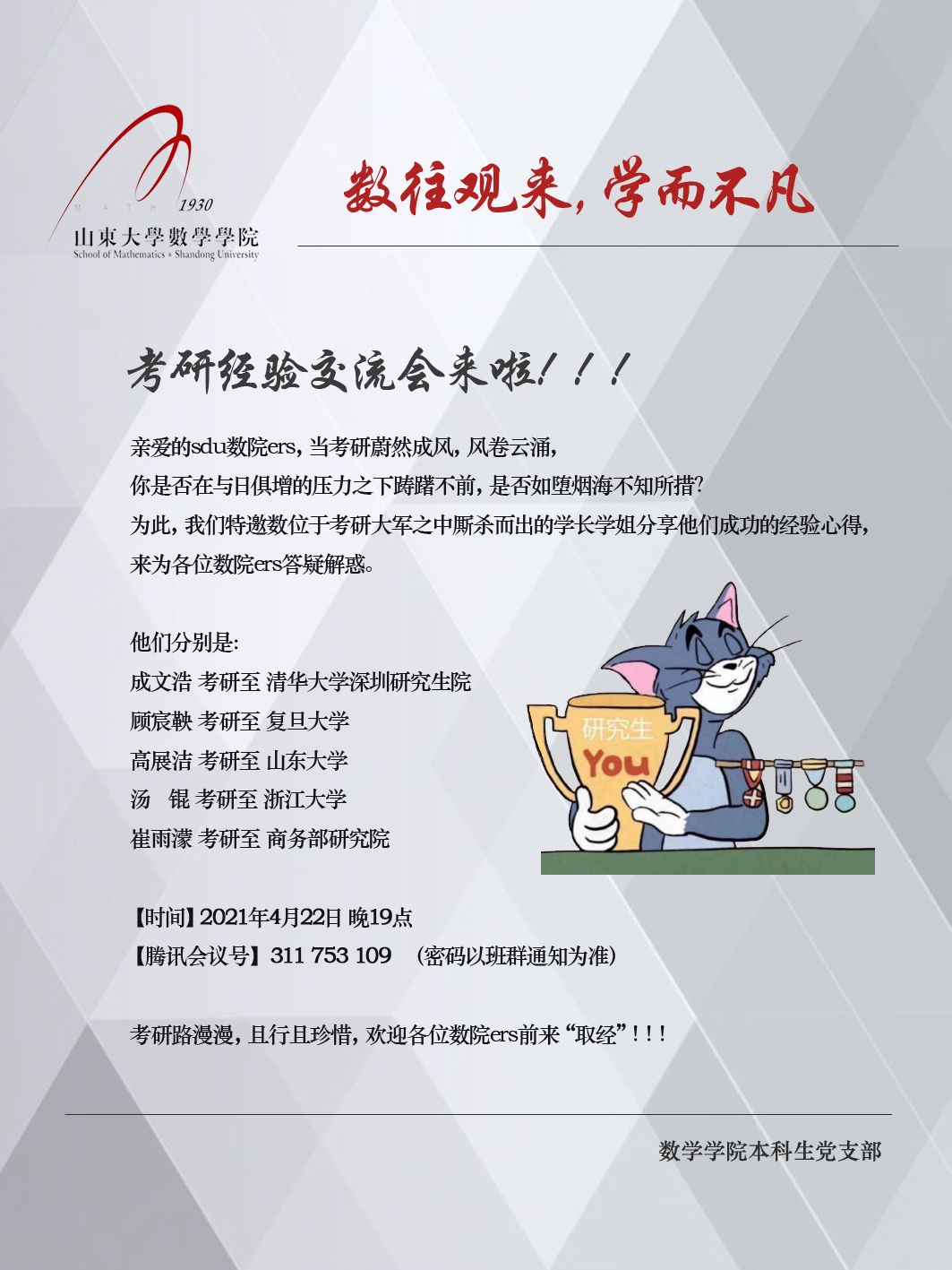2021年研究生考试已接近尾声,为帮助数院学子了解研究生考试,科学制定考研目标,正确规划自己的学习生活,BB贝博艾弗森官网本科生党支部特邀请五位学长学姐举办考研经验交流会,相关事宜如下: