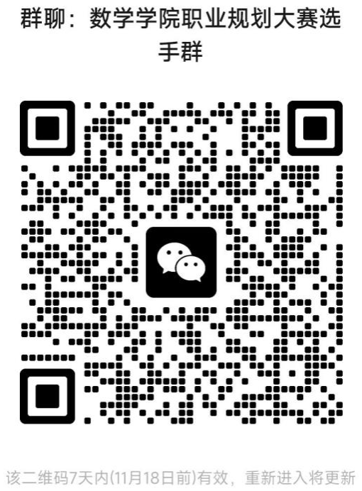 (三)请全体参赛选手于11月17日24:00前扫码进入微信群“BB贝博艾弗森官网职业规划大赛选手群”,并在群内以“姓名+年级+本科/研究生+成长赛道/就业赛道”的格式实名备注。大赛后续事项将在群内通知。