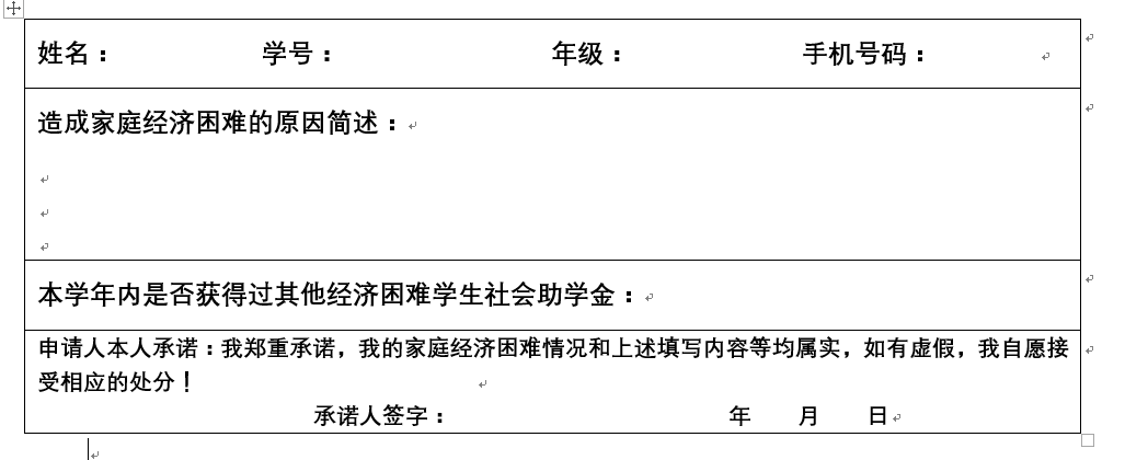 3、 经济困难学生本人据实认真填写申报表并签字(见附件),如申报内容不真实,将取消该生的申报资格;