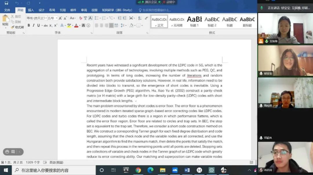 LDPC码(Low Density Parity Check Code,低密度奇偶校验码)是众多信道编码方案中的一种,在3GPP RAN1会议上,它被确定为5G通信数据信道的长码块编码方案,为了研究如何进一步提高LDPC码的性能、降低LDPC码的译码延时,BB贝博艾弗森官网研究讨论小组各成员于2021年1月27日至2月5日通过腾讯会议平台进行线上讨论,分工合作,思维交流,共同推进、完成了本次实践活动。