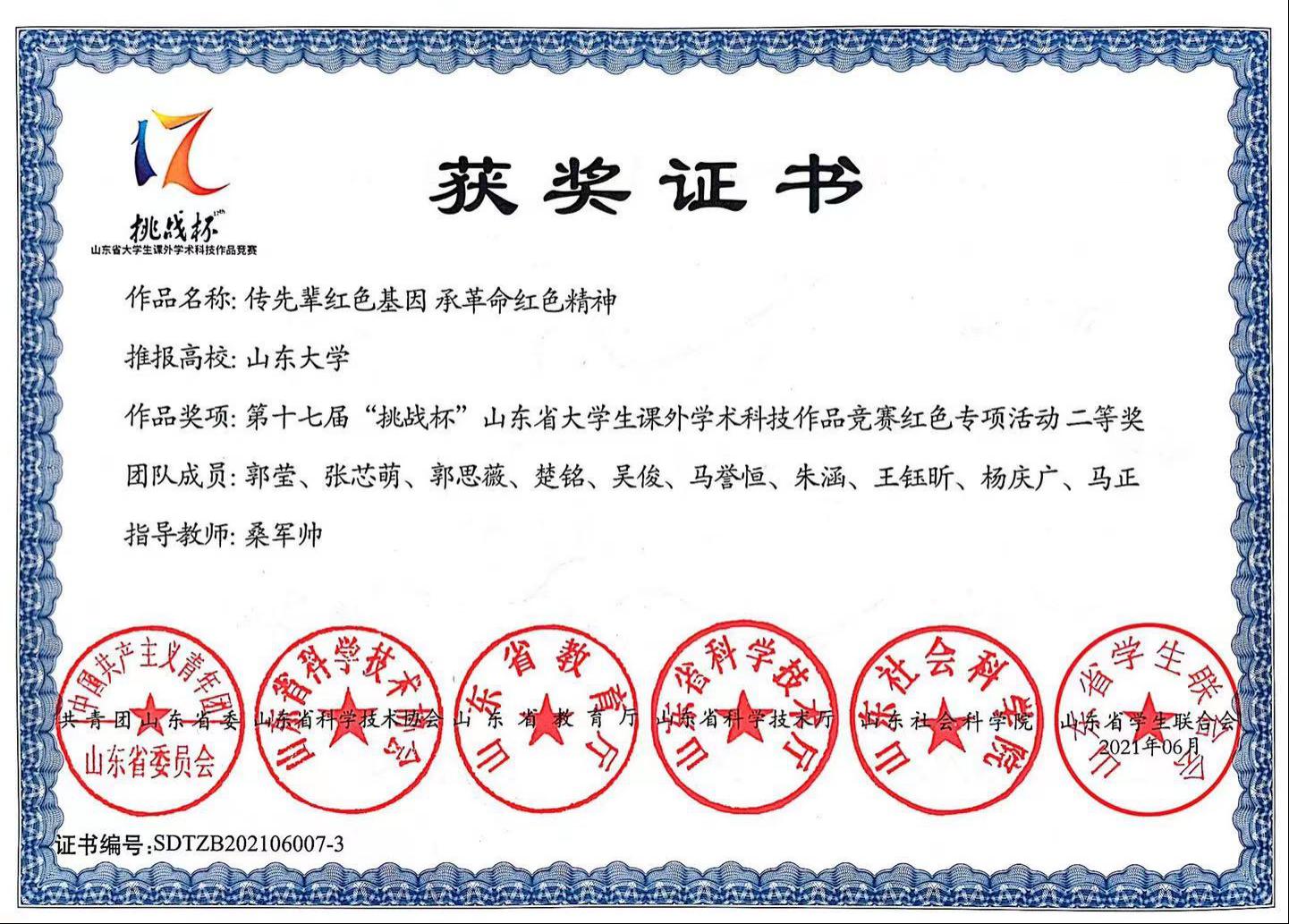 BB贝博艾弗森官网2020级金融数学班郭莹等十位本科生组成的“小红花团队”荣获第十七届“挑战杯”山东省大学生课外学术科技作品竞赛红色专项活动二等奖。
