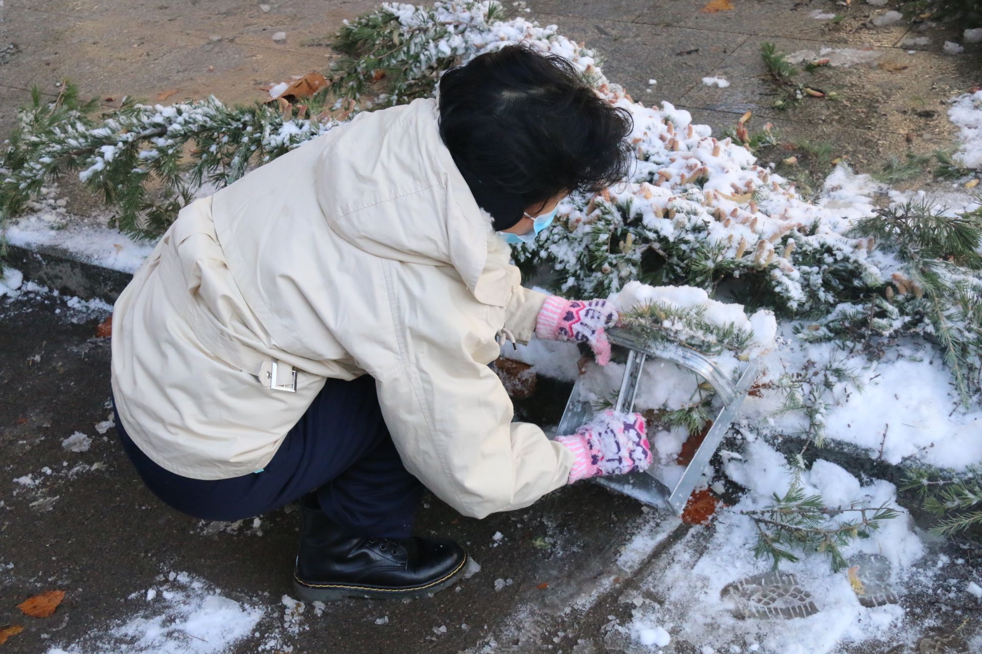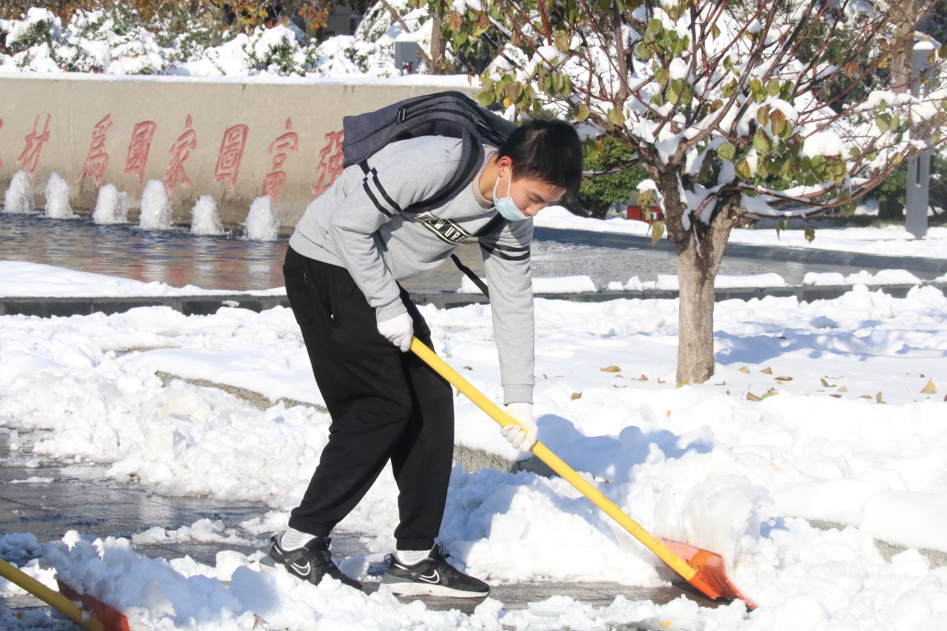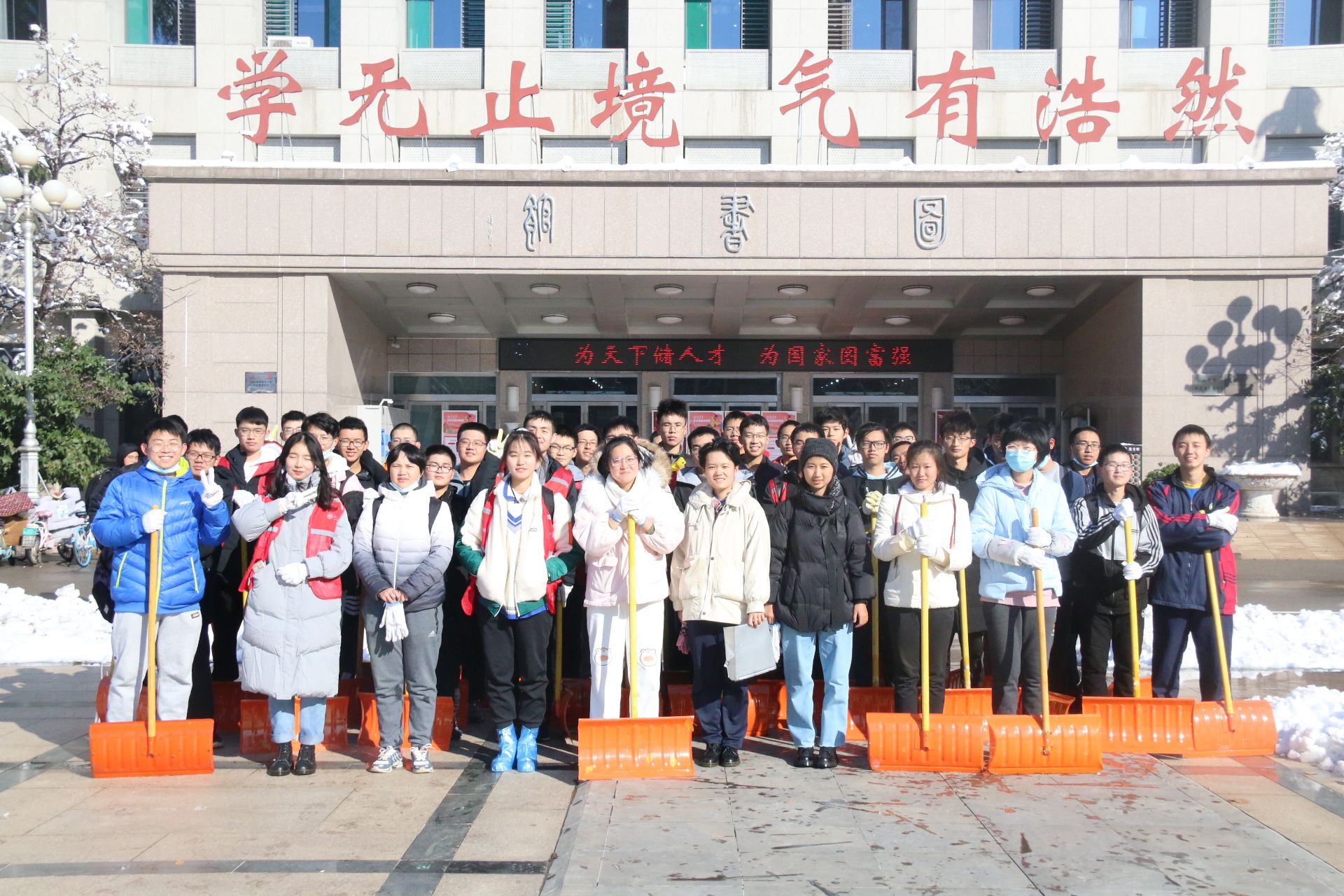 在大家的通力合作下,扫雪任务进展顺利,同学们不仅在规定的时间内完成了应有的任务,还额外清理了至圣路和大城广场的结冰。9时50分,宋金灿老师与同学们在图书馆前合影留念。