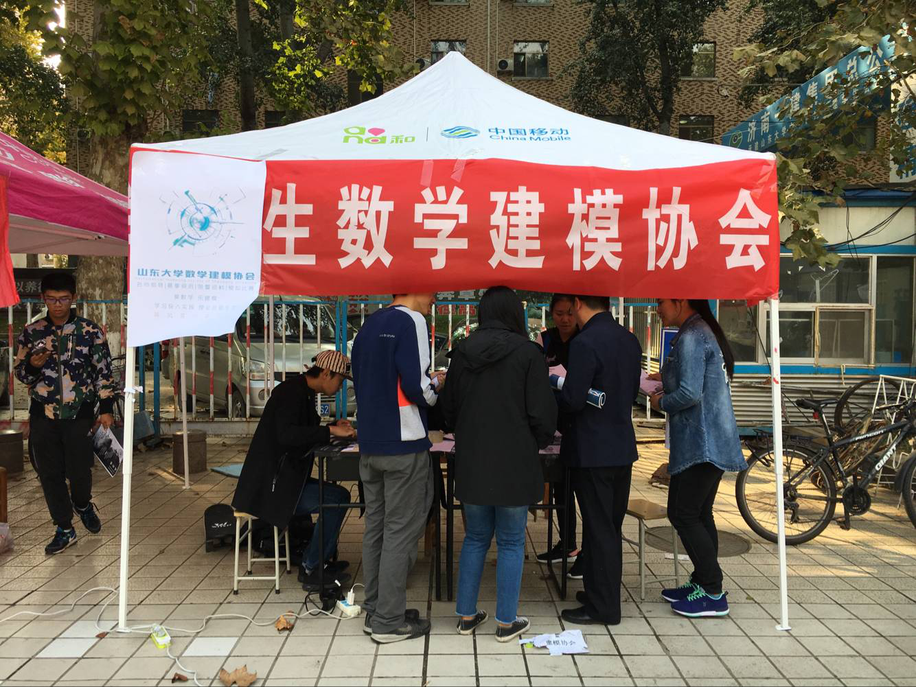 虽然今天是百团大战的第二天,天气也比前一天寒冷,来现场的同学不如前一天多,但建模协会还是凭借优秀的宣传、积极的态度、精品的活动吸引了很多新生,来报名的同学在展台前排起长队。这充分体现了数学建模协会作为山大唯一一个山东省优秀大学生科技社团的号召力,以及各类数模相关活动对同学们的吸引力。
