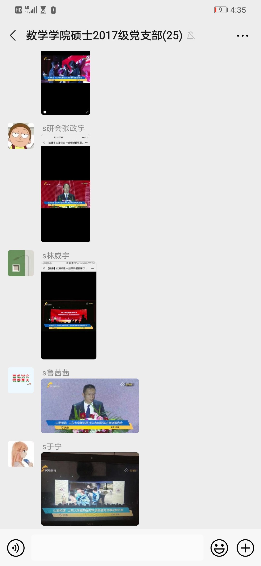 6月2日下午,博士第二党支部组织党员观看BB贝博艾弗森官网援鄂医疗队表彰暨先进事迹报告会,看完后内心受到极大的震撼。他们中有紧急出发来不及告诉父亲的医生郝学喜,也有将温情带给病人,悉心照顾患者的孙元婧护士,有严格守卫护士健康的护士长曹妈妈,也有守护生命、践行誓言的医生周敏。他们一个个用自己的亲身经历讲述着在湖北武汉发生的富有情感的温情故事,那个“先别管我,先看我哥”的老奶奶将亲情演绎的动人心脾,还有对护士说“别靠近我”,说自己能行的老阿姨,在生命面前,她们和许多人一样,敬畏着生命,热爱着生命。牙有反哺之义,羊有跪乳之恩。在疫情面前,一批批新时代的80后、90后山大青年扛起了救国家于危难中的旗帜,他们不畏艰险,勇敢前行,用行动向全国和全世界展示了山大的责任与担当。
