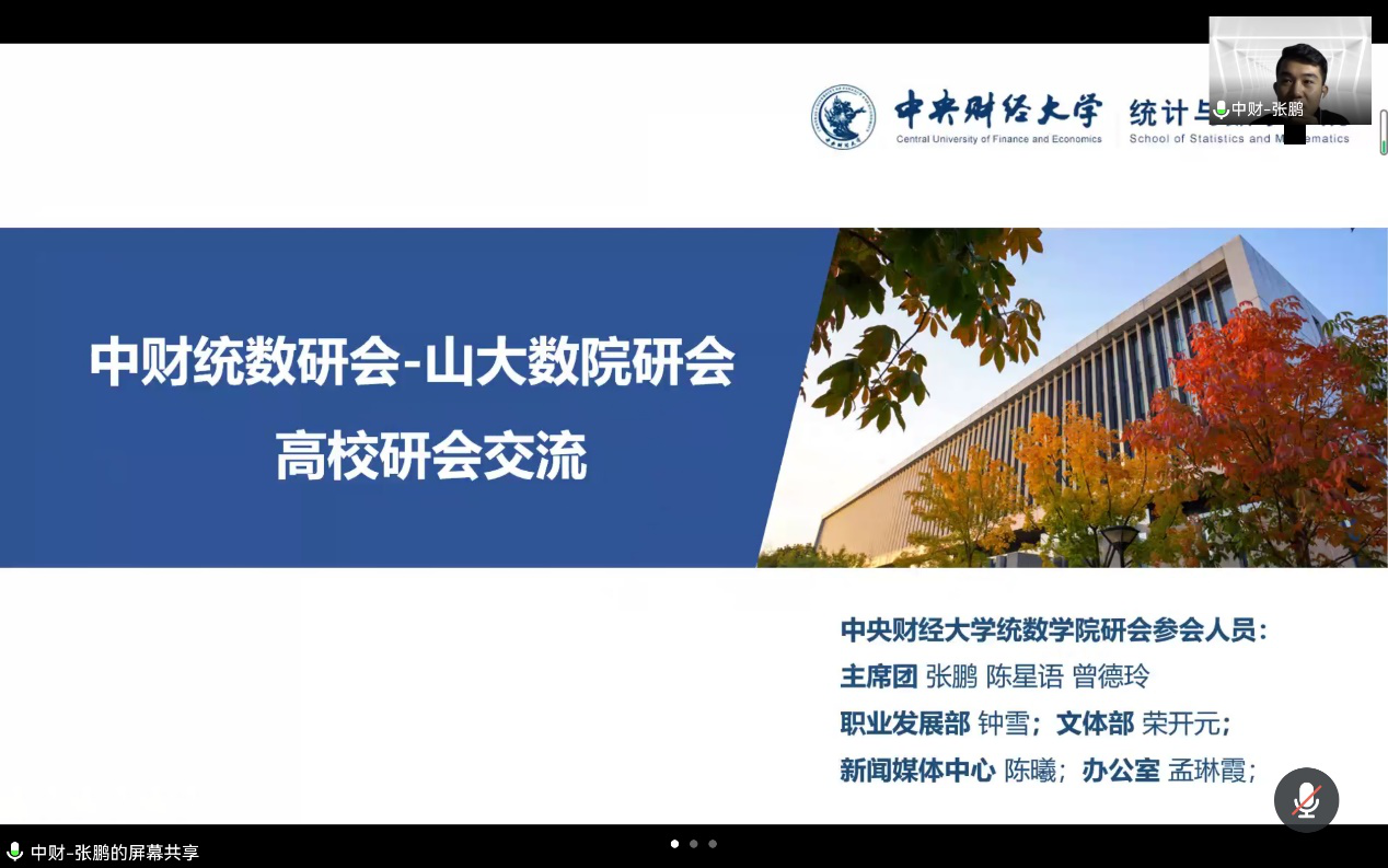 接着,中央财经大学统数研会代表张鹏介绍了其研会的构成及每个部门的基本职责,着重分享了为了维护学院数据安全研会成员所参加的有意义的活动,而后提出了其研会的主要工作方向以及对研会改革的构想。文体部部长荣开元分享了研会破冰、毕业晚会等活动的特色环节。职业发展部部长钟雪分享了广受同学们好评的讲座的相关策划,主要包含前期调研、联系嘉宾、表达诉求、听取建议、敲定主题等几个环节。参会代表们对校友资源获取及校友们的时间和意愿等问题进行了激烈的探讨。办公室部长孟林霞介绍了其主要工作内容包括物资购买、发票开具、活动复盘、资料整理总结与文字汇报等。新媒体部长陈曦阐述了其研会与山大组织的不同,他们与本科生学生会共同运营微信公众号“中财统数”,并在学院官网发布新闻和通知。之后,参会代表们就如何调动研会成员的积极性和参与感以及如何平衡日常活动与科研活动进行了思想的交流碰撞,对活动月“数学符号”的起名讨论了其蕴含意义,希望互相学习以办更有趣更吸引人的活动来丰富大家的研究生生活。