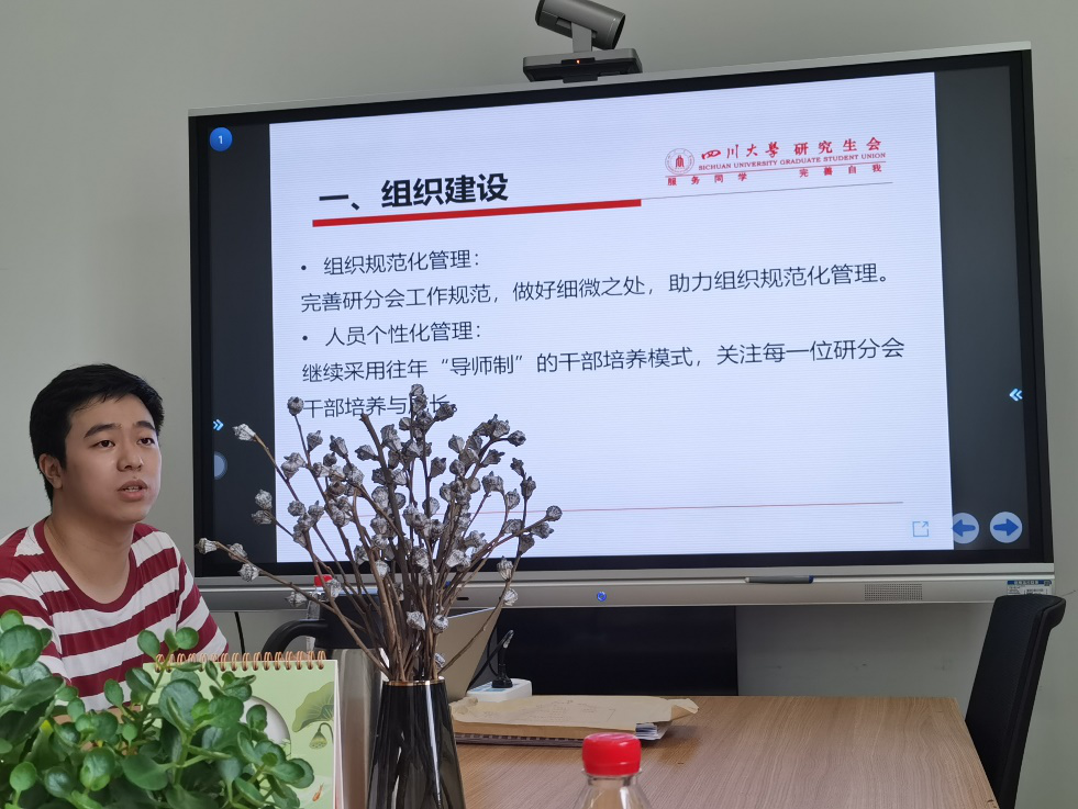 随后,BB贝博艾弗森官网研会主席丁圣男介绍了BB贝博艾弗森官网“德智体美劳”全面培养的研会工作体系,并且从组织建设、活动总结、特色工作三个方面展开详细介绍,认为研会应该把“以人为本”作为工作导向,将服务于同学放在研会工作首位,研究生活动应更适合现实的需要。为庆祝建党百年,献礼百廿山大,丁圣男主席表示BB贝博艾弗森官网研会相应开展了“汲取红色文化”、“感悟红色精神”、“重温红色经典”等党日活动,文理交融,加强了BB贝博艾弗森官网师生精神素养。最后,丁圣男主席在介绍院系品牌活动“知数答理”时,将BB贝博艾弗森官网研会目前存在的新媒体建设与品牌活动创新方面的不足与大家进行了探讨。