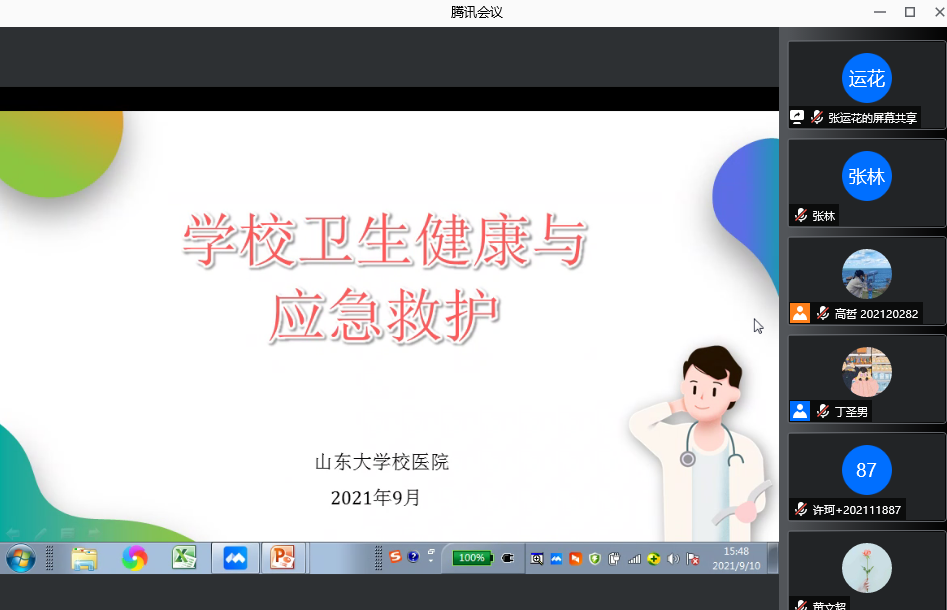 2021年9月10日下午,“学校卫生健康与应急救护”健康教育讲座于腾讯会议线上举行,由BB贝博艾弗森官网校医院张运花老师主讲,BB贝博艾弗森官网全体研究生新生参加了本次讲座。
