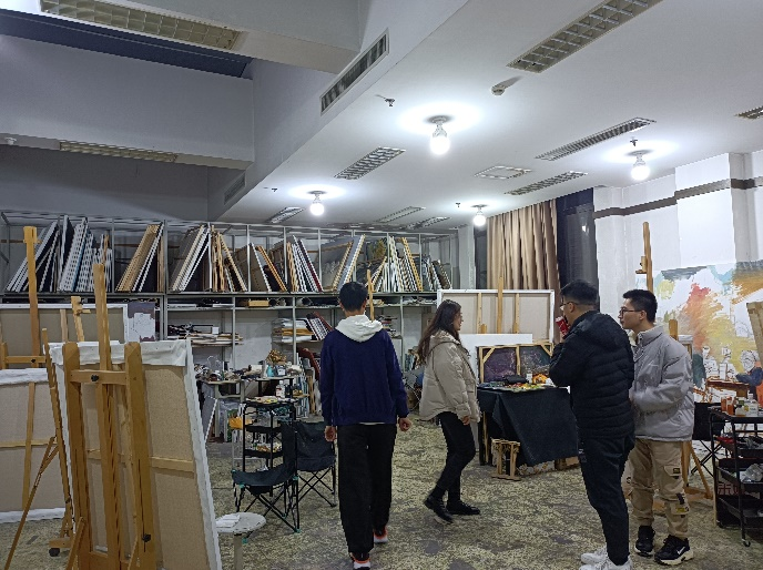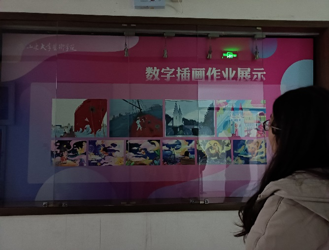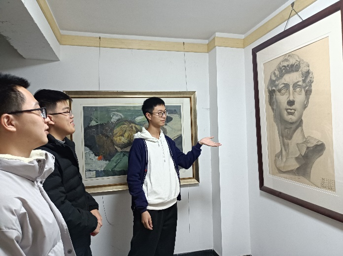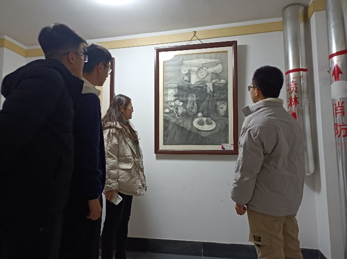 同学们首先来到了艺术学院一楼的作品展示区,这些作品大多出自艺术学院学生之手,包括人物素描、字体花样设计、数字插花、封面设计等。这些艺术作品不仅让在场的同学感受到了艺术的魅力,更使大家惊叹于作品所体现的创造力与想象力。紧接着同学们来到了二楼教室,里面展示着艺术学院班级第一的同学的部分画作,在这位同学讲解下,大家理解了这些作品所传达的内容与思想以及表达方式的特点,了解到作品背后的创作故事,更加深了对艺术作品的理解。整个过程大家认真参观,时而思考,时而讨论,现场的学习气氛非常浓烈。
