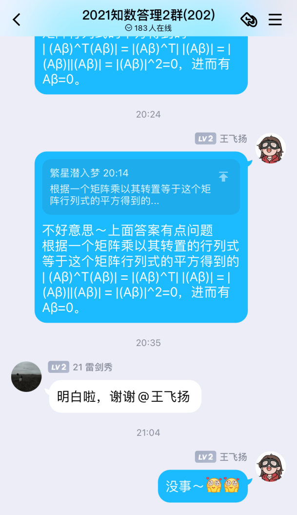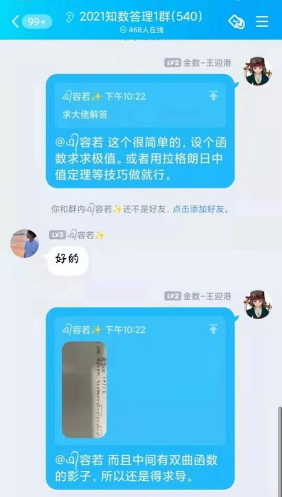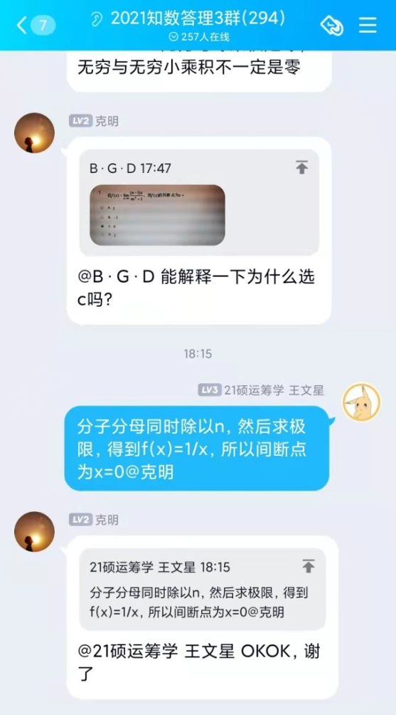 自活动开展以来,共收到来自全校一千四百余名同学加入答疑群的申请,BB贝博艾弗森官网“阿尔法”答疑志愿团队,平均每周解答疑问近两百条。志愿者们耐心地为同学们讲解定理证明,分享解题技巧,梳理答题思路,引导同学们由“被动接受”转向“主动思考”,在加深自己对数学基础知识理解的同时,体会到以自己所学服务、帮助他人的成就感与幸福感。活动开展期间,同学们积极讨论,勤于思考,不仅及时解决了在数学学习上遇到的问题,更提升了数学学习能力,激发了学习数学的积极性。