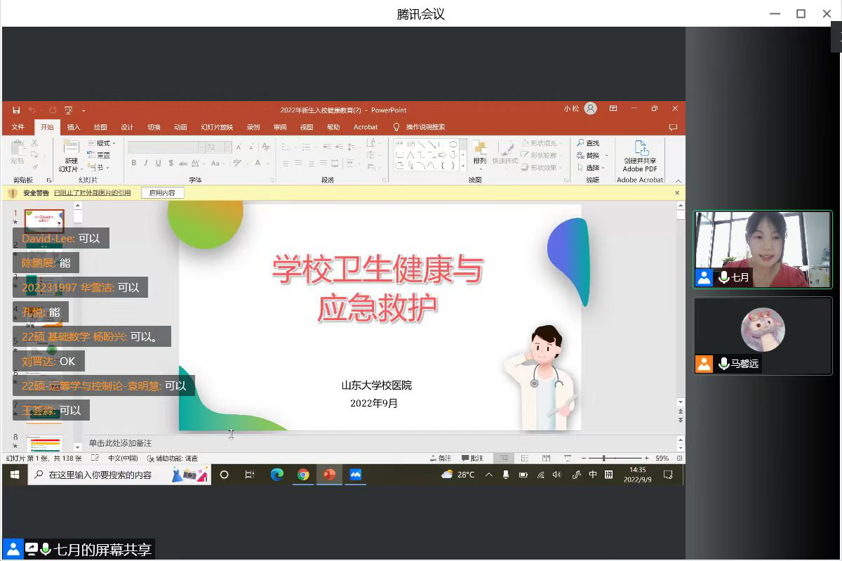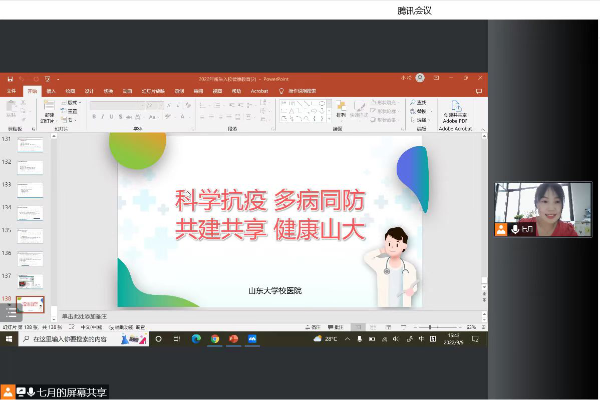 入学健康教育课是每位新生的必修课,为了让各位新生树立健康理念,做好自己健康的第一责任人,BB贝博艾弗森官网于2022年9月9日下午举办健康教育讲座。讲座由BB贝博艾弗森官网校医院张医生主讲,BB贝博艾弗森官网全体研究生新生参加。