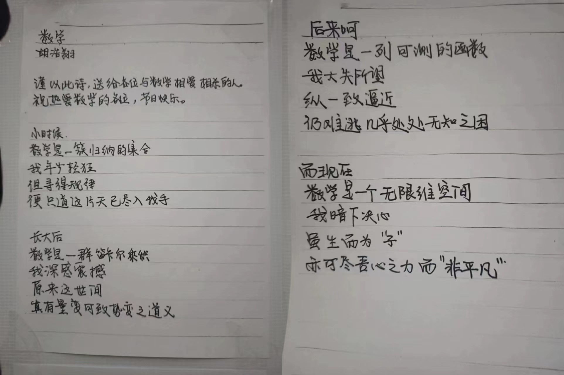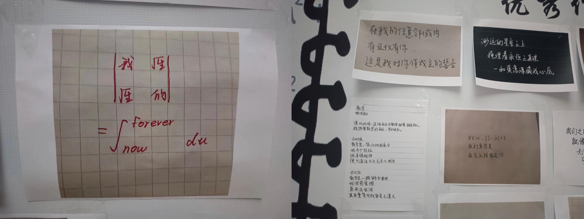 最后,大家一同欣赏了笔记大赛的优秀作品。无论是上课认真记录的笔记,还是用数学知识才能解出的浪漫等式,又或是渗透数学名词的简短诗歌,都让同学们体会到了数学与美的结合。刚刚过去的国际数学日的主题是“给每一个人的数学”,数学不是天才的专利,人人都能感受数学之美!数学的魅力,无处不在;数学的艺术,装点生活。
