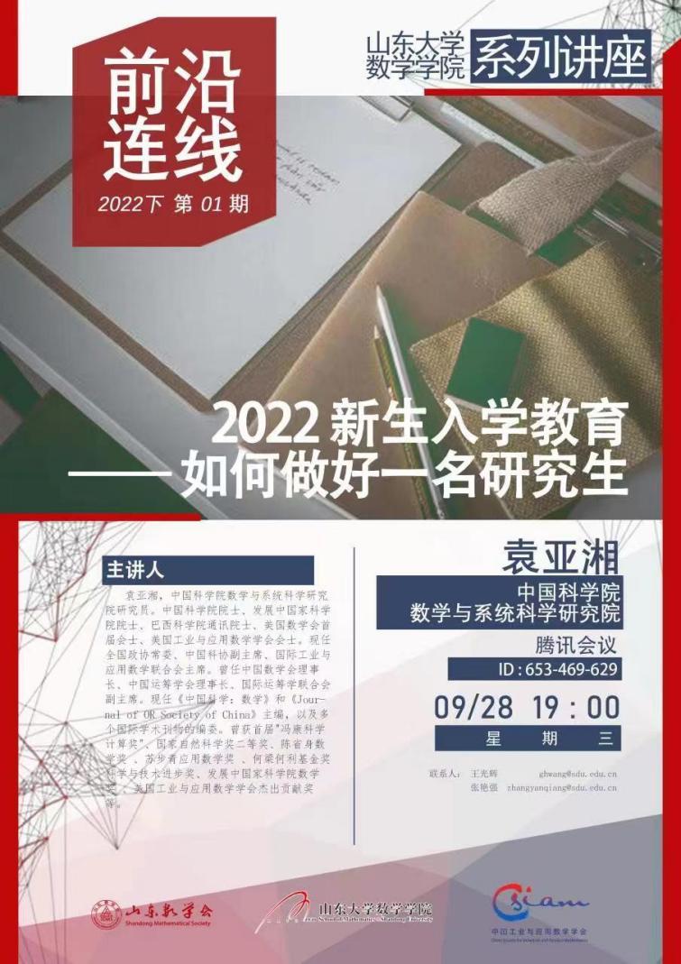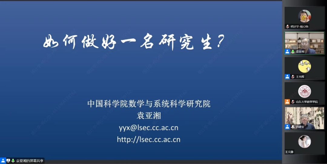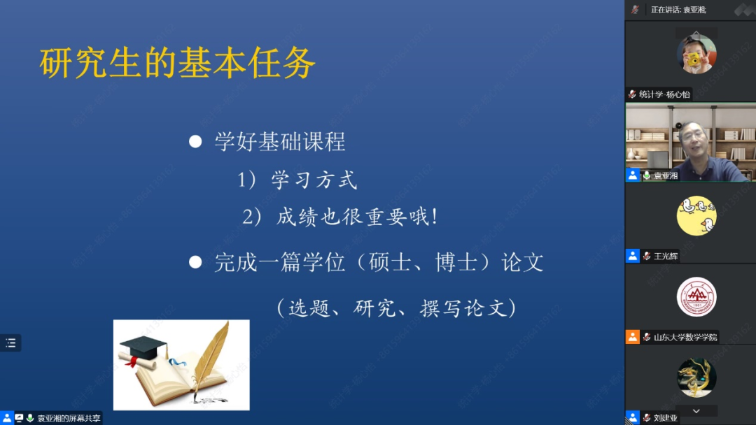 为引领全体硕士、博士研究生新生坚定理想信念,传承山大基因,提升科研素养,促进全面发展,BB贝博艾弗森官网于2022年9月28日晚在腾讯会议举办了“导学思政下午茶——新生入学教育系列”活动之“如何做好一名研究生”。本次报告由中国科学院院士袁亚湘主讲,BB贝博艾弗森官网副校长刘建亚主持,BB贝博艾弗森官网党委书记王光辉出席,BB贝博艾弗森官网全体研究生新生参加。