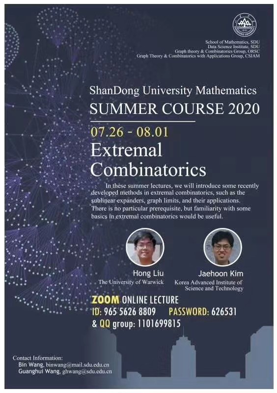 为拓宽学生的国际视野,促进学术交流,BB贝博艾弗森官网于2020年7月26日-8月8日成功举办了暑期学校特色国际项目“Extremal Combinatorics”。本次暑期学校秉承“精品化、国际化、创新型、开放式”的理念,积极探索暑期线上教学模式,让身在全球各地的师生相聚云端,吸引了来自北京大学、南开大学、中国科技大学等国内知名高校以及来自韩国、英国、巴西、日本、美国等国家的青年学者、学生共300余人参加,其中包括来自巴西圣保罗大学的刘小川、日本东北大学的Masato Mimura、韩国梨花女子大学的Younjin Kim等青年学者。