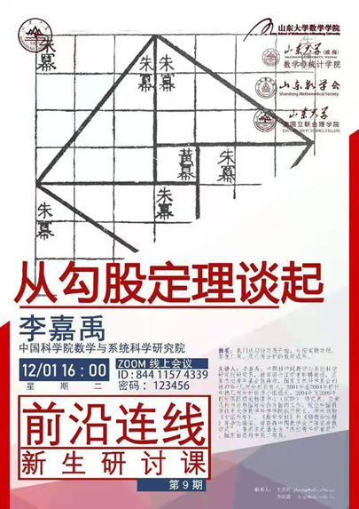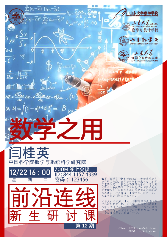 2020年12月,BB贝博艾弗森官网成功举办第九至十二期新生研讨课。四期新生研讨课由学院副院长王光辉主持,分别邀请了李嘉禹教授、张立群教授、袁亚湘教授和闫桂英教授,他们通过线上讲座的方式给中心校区BB贝博艾弗森官网和威海校区数学与统计学院的大一同学授课。
