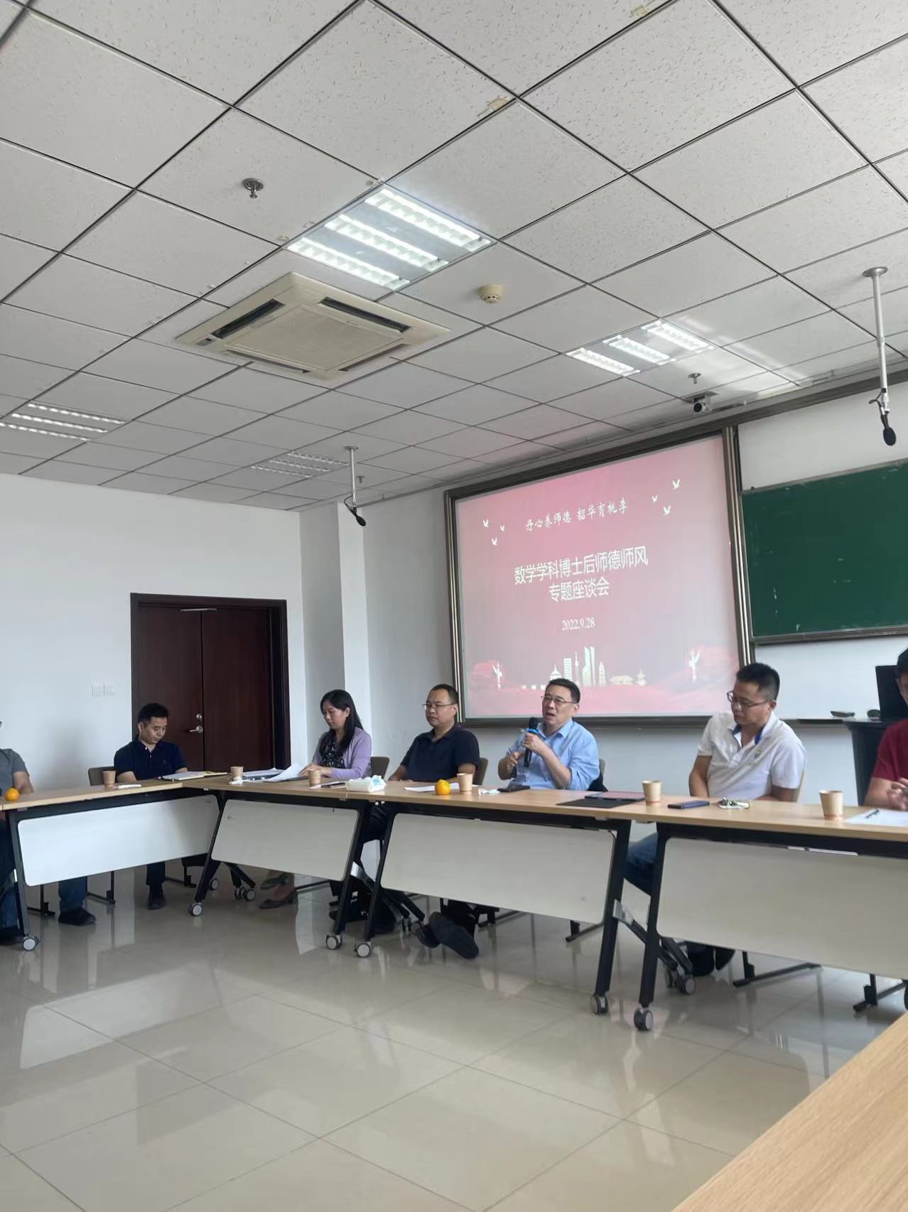 2022年9月28日,BB贝博艾弗森官网在知新楼举办“韶华育桃李,丹心养师魂”工作坊系列活动——数学学科博士后师德师风专题座谈会。副校长、院长吴臻、党委书记王光辉、常务副院长胡锡俊和学院全体领导班子出席座谈会,学科共20余名数学和统计学流动站的博士后与工作人员参加了座谈。