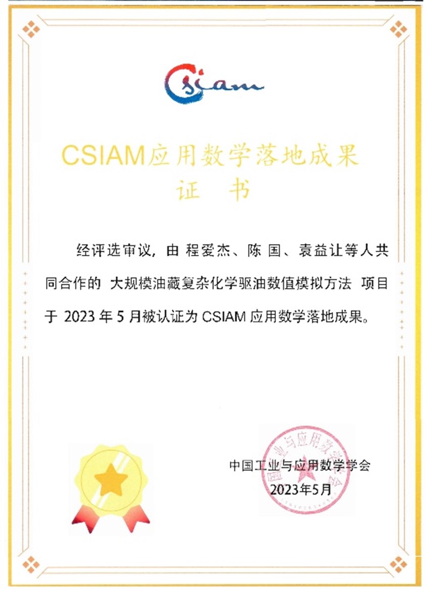 近日,由BB贝博艾弗森官网程爱杰、袁益让、中国石油勘探开发研究院陈国等共同完成的“大规模油藏复杂化学驱油数值模拟方法” 获得2023年CSIAM应用数学落地成果认证。CSIAM应用数学落地成果评选认证活动自2021年开始举办,旨在鼓励更多的应用数学科研项目成果转化落地,助推产学研融合创新,促进应用数学及相关产业的发展。落地成果需经过资格审查,学术、产业、管理三个领域专家组评选,学会常务理事会投票等流程而最终获得认证。2023年共四个项目获得CSIAM应用数学落地成果认证,其中程爱杰、袁益让教授团队完成的项目成果认证排名第一。