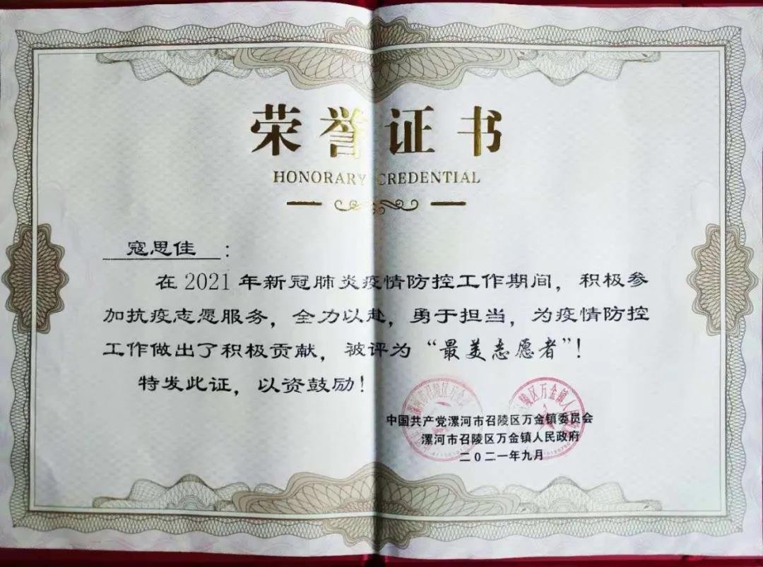 寇思佳同学是漯河职院双汇学院2021级大数据与会计专业学生。面对突发的新冠肺炎疫情,她积极响应倡议,全力投身抗击疫情,积极参加抗疫志愿服务。2021年8月10号至9月22号,作为村防疫站防控小组的一员,她协助村干部做好人员管控、体温测量、返村人员登记等工作,用责任担当奏响了一曲英勇的青春凯歌,获得漯河市召陵区万金镇“最美志愿者”等荣誉。