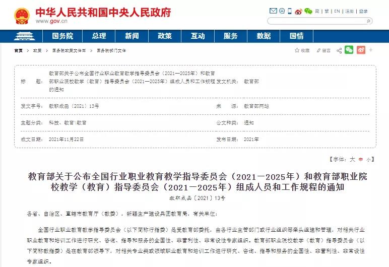 全国行业职业教育教学指导委员会是受教育部委托,由行业主管部门、行业组织等牵头组建和管理,对相关行业职业教育和培训工作进行研究、咨询、指导和服务的全国性、非营利性、非常设性专家组织,共设置行指委57个,委员遴选坚持专业性、高标准,兼顾区域分布,经推荐、初选、征求相关方面意见、复核、公示等程序,产生来自行业企业、职业院校、普通本科高校和研究机构等单位的委员,充分凸显职业教育专家组织特色。