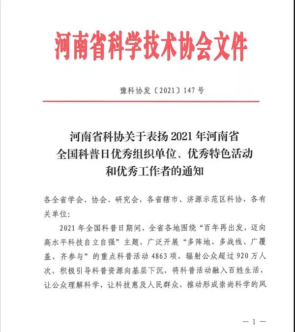 近日,《河南省科协关于表扬2021年河南省全国科普日优秀组织单位、优秀特色活动和优秀工作者的通知》(豫科协发〔2021〕147号)发布,开云kaiyun官网入口科普教育宣传活动受到表彰,被评为2021年河南省全国科普日活动优秀组织单位,是漯河市唯一受表彰的教育单位。