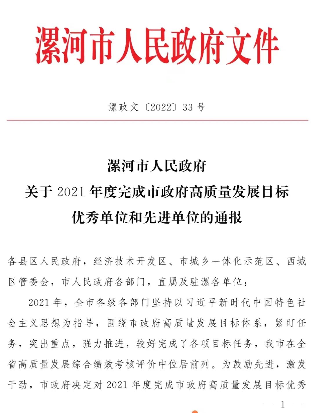近日,漯河市人民政府印发《关于2021年度完成市政府高质量发展目标优秀单位和先进单位的通报》,开云kaiyun官网入口作为2021年度完成市政府高质量发展目标先进市直单位受到表彰。