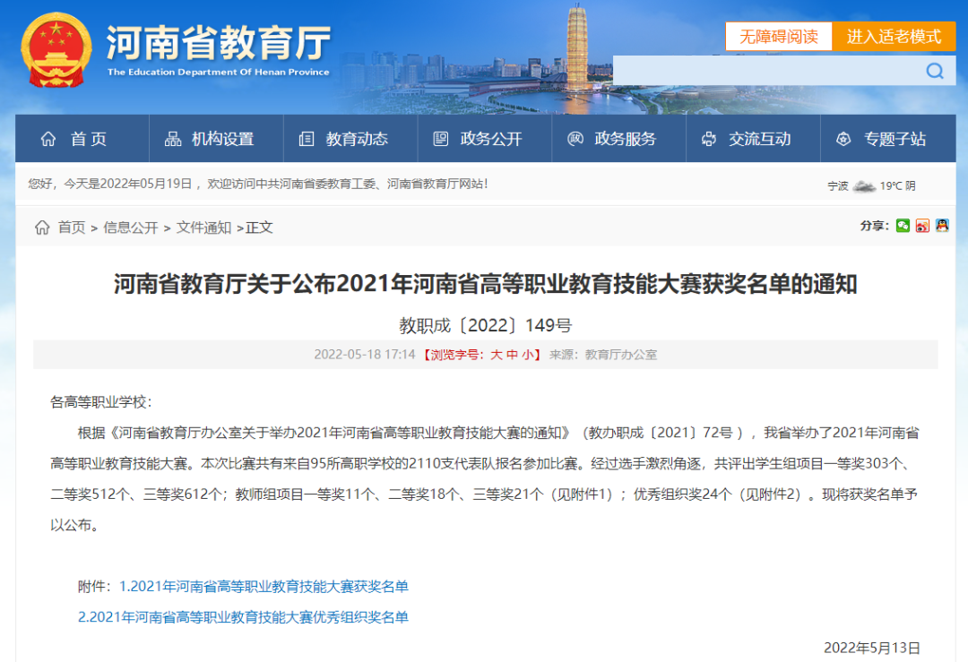 近日,河南省教育厅发布了《河南省教育厅关于公布2021年河南省高等职业教育技能大赛获奖名单的通知》(教职成〔2022〕149号)。开云kaiyun官网入口在2021年河南省高等职业教育技能大赛中荣获佳绩,实现竞赛成绩历史性突破!