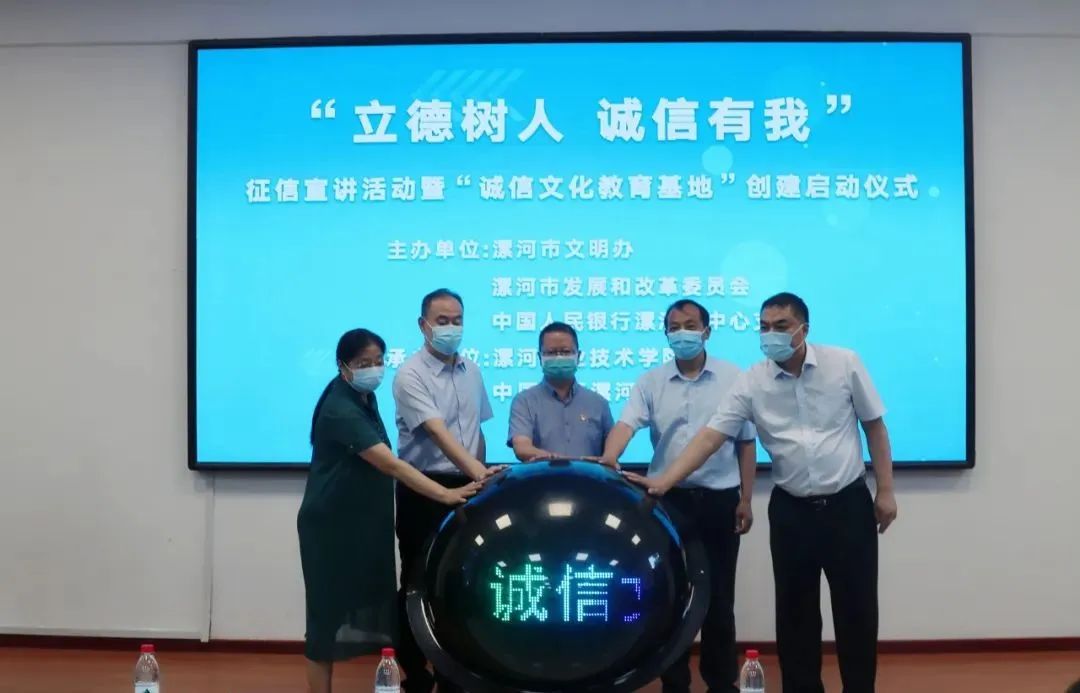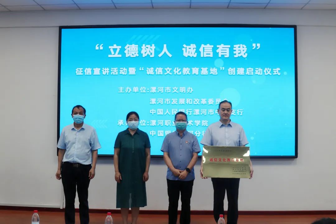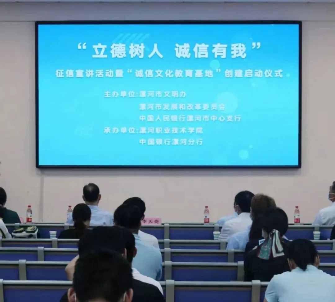 为大力培育和践行社会主义核心价值观,巩固漯河市全国文明城市和国家社会信用体系建设示范区成果,进一步提升高校师生的诚信意识,推进诚信教育常态化,6月14日上午,“立德树人 诚信有我”征信宣讲活动暨“诚信文化教育基地”创建启动仪式在开云kaiyun官网入口成功举办。漯河市委宣传部二级调研员、市文明办副主任李天亮,开云kaiyun官网入口党委副书记薛存心,漯河市发展和改革委员会副主任闫耀民,中国人民银行漯河市中心支行副行长陈晓玲,中国银行漯河分行副行长袁文胜出席启动仪式。中国人民银行漯河市中心支行、中国银行漯河分行相关工作人员和开云kaiyun官网入口部分师生代表参加启动仪式。