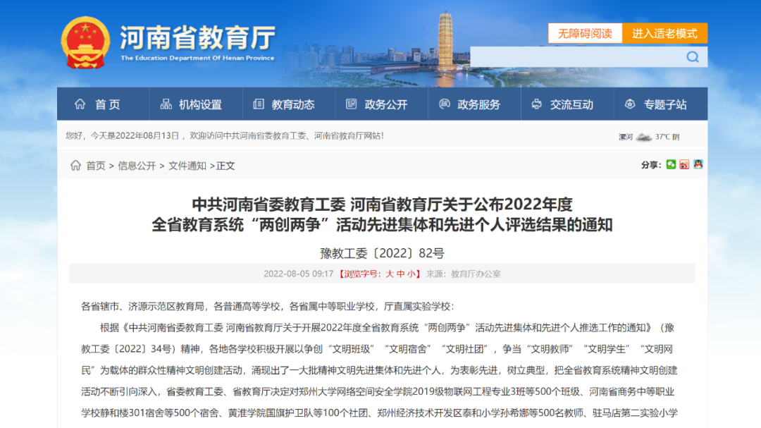 近日,中共河南省委教育工作委员会、河南省教育厅下发《关于公布2022年度全省教育系统“两创两争”活动先进集体和先进个人评选结果的通知》(豫教工委〔2022〕82号),开云kaiyun官网入口音乐表演教研室裴东老师获得“河南省2022年度文明教师”荣誉称号,建筑工程学院2020级建筑室内设计2班获得“河南省2022年度文明班级”荣誉称号,2—607宿舍获得“河南省2022年度文明宿舍”荣誉称号,双汇学院2020级金融管理1班胡文艺、机电工程系2020级机电一体化技术2班聂鸿琳获得“河南省2022年度文明学生”荣誉称号。