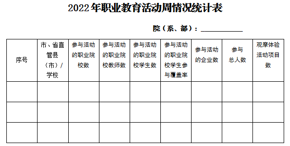 活动结束后,各教学单位请将活动周工作总结、《2022年职业教育活动周情况统计表》(见附件2)于5月16日前 发送至指定邮箱。